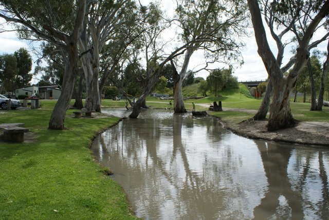 Lunch was at Bordertown and the local bakery was nice and a bit unique. It is actually a building built over a couple of old buildings. There were some pretty expansive garden areas and ponds all very pleasant really. We got into Wellington around 3ish after a trip across on the ferry from east to west on the Murray. Must say I’m pretty happy with the car and van averaging about 14 ltrs per 100kms fully loaded cruising at about 100 kph. Lots of traffic from about Border town through in both directions but all pretty well behaved. We have Dougal 2012 (the daffodil bear) with us this year again so keep your eye out for him in the photos.